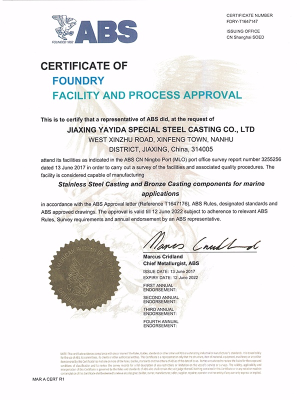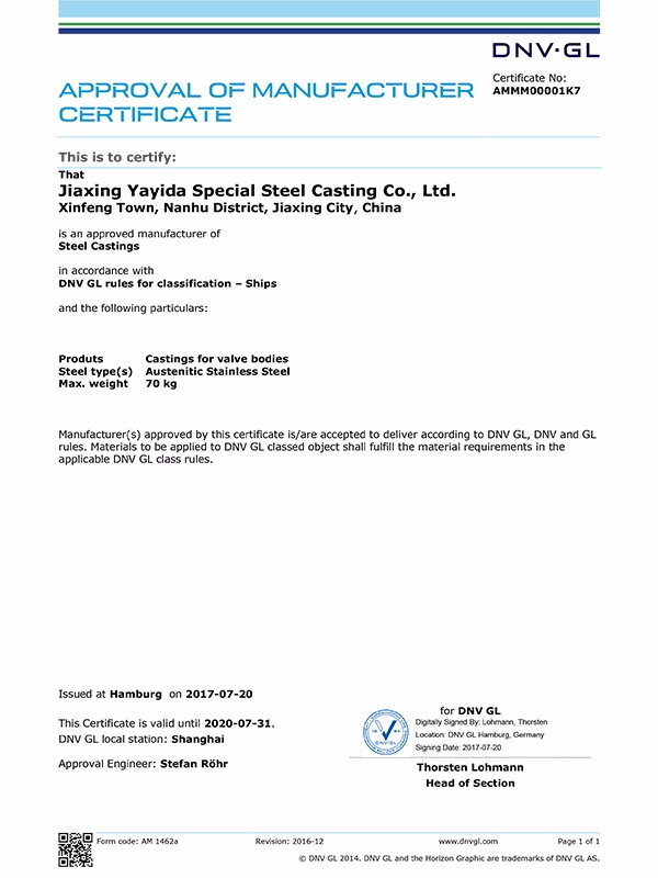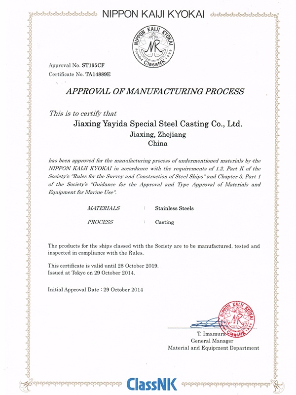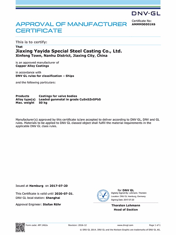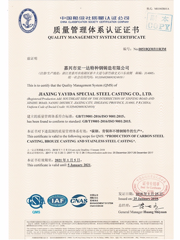公司擁有先進的鑄造、機加工及理化分析檢測設備、并嚴格按照ISO9001國際質量體系的標準導入管理和運營、企業(yè)分別獲得了中國船級社CCS、日本船級社NK、英國船級社LR、美國船級社ABS、挪威與德國船級社DNV·GL、歐盟PED認證等多方國家的產(chǎn)品認證和工廠認可。