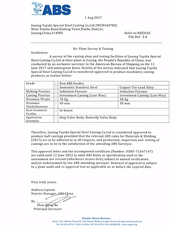嘉興市亞一達特種鋼鑄造有限公司是亞達企業(yè)下設子公司之一,地處長江三角洲地帶的浙江省嘉興市南湖經(jīng)濟開發(fā)區(qū),廠房占地面積15000m2,鑄造廠6000m2、機加工車間3000m2,現(xiàn)有職工100多人。主要產(chǎn)品為各種牌號的精密鑄件及以GB、CB、API為標準的蝶閥、球閥、截止閥、低溫閥等艦船閥門。